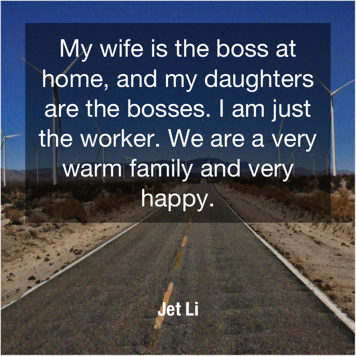 Jet Li Jet Li – My wife is the boss… June 8, 2019 admin “My wife is the boss at home, and my daughters are the bosses. I am just the worker. We are a very warm family and very happy.”-Jet Li