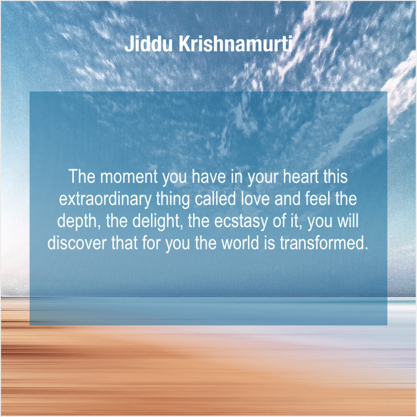 Jiddu Krishnamurti Jiddu Krishnamurti – The moment you have in… September 28, 2019 admin “The moment you have in your heart this extraordinary thing called love and feel the depth, the delight, the ecstasy of it, you will discover that for you the world is transformed.”-Jiddu Krishnamurti