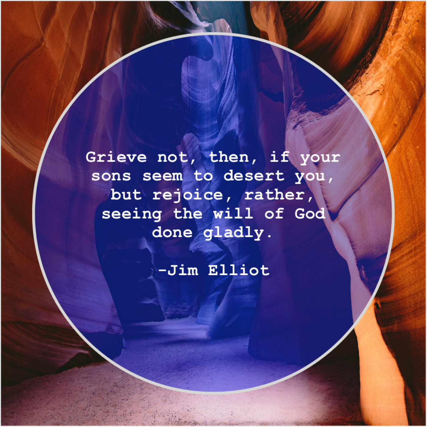 Jim Elliot Jim Elliot – Grieve not, then, if your… May 29, 2019 admin “Grieve not, then, if your sons seem to desert you, but rejoice, rather, seeing the will of God done gladly.”-Jim Elliot