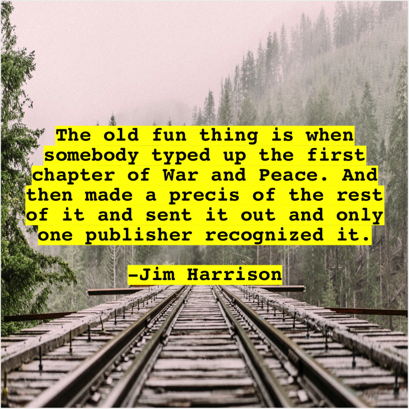 Jim Harrison Jim Harrison – The old fun thing is… January 7, 2019 admin “The old fun thing is when somebody typed up the first chapter of War and Peace. And then made a precis of the rest of it and sent it out and only one publisher recognized it.”-Jim Harrison