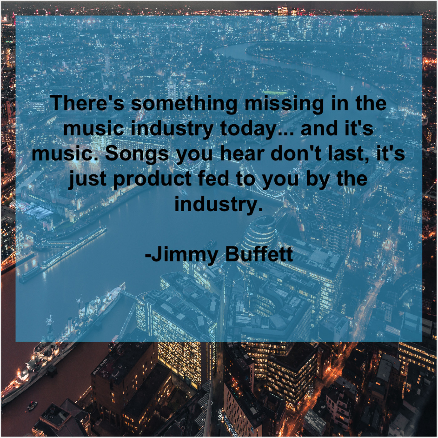 Jimmy Buffett Jimmy Buffett – There’s something missing in the… April 23, 2019 admin “There’s something missing in the music industry today… and it’s music. Songs you hear don’t last, it’s just product fed to you by the industry.”-Jimmy Buffett
