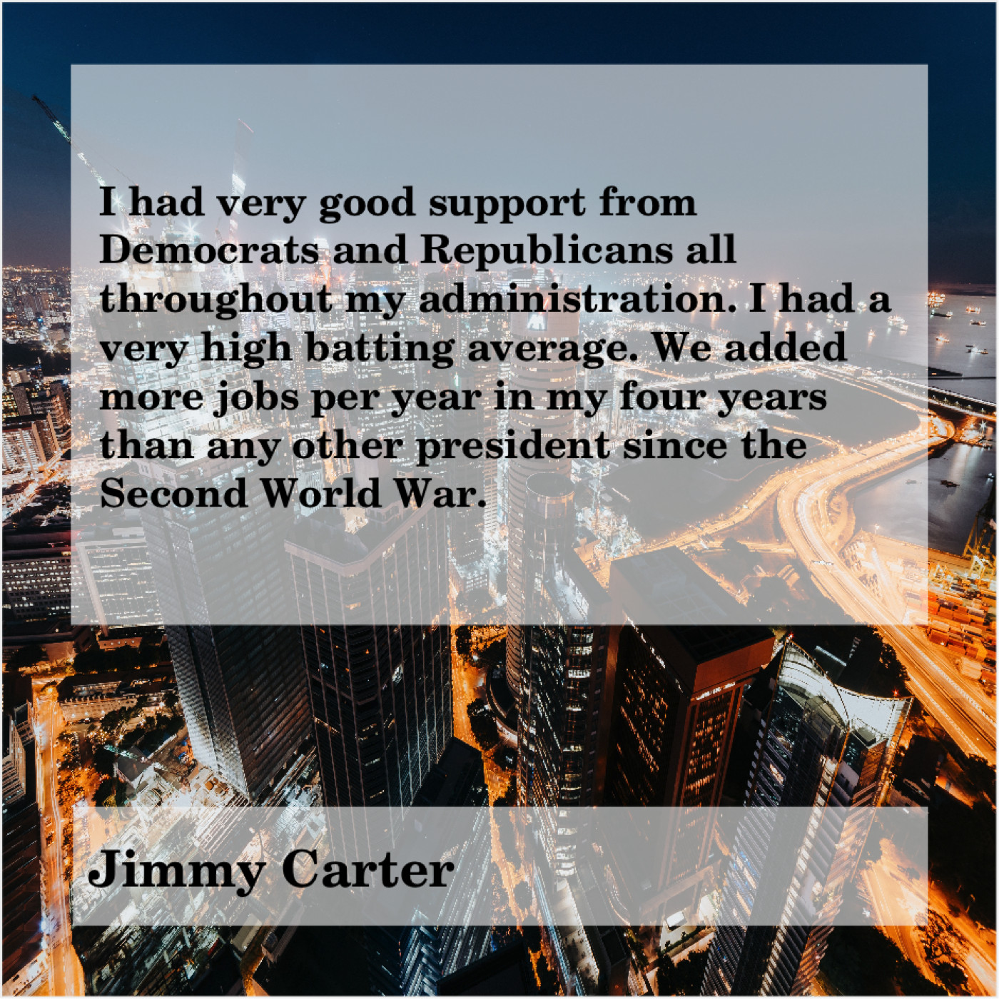 Jimmy Carter Jimmy Carter – I had very good support… April 16, 2019 admin “I had very good support from Democrats and Republicans all throughout my administration. I had a very high batting average. We added more jobs per year in my four years than any other president since the Second World War.”-Jimmy Carter