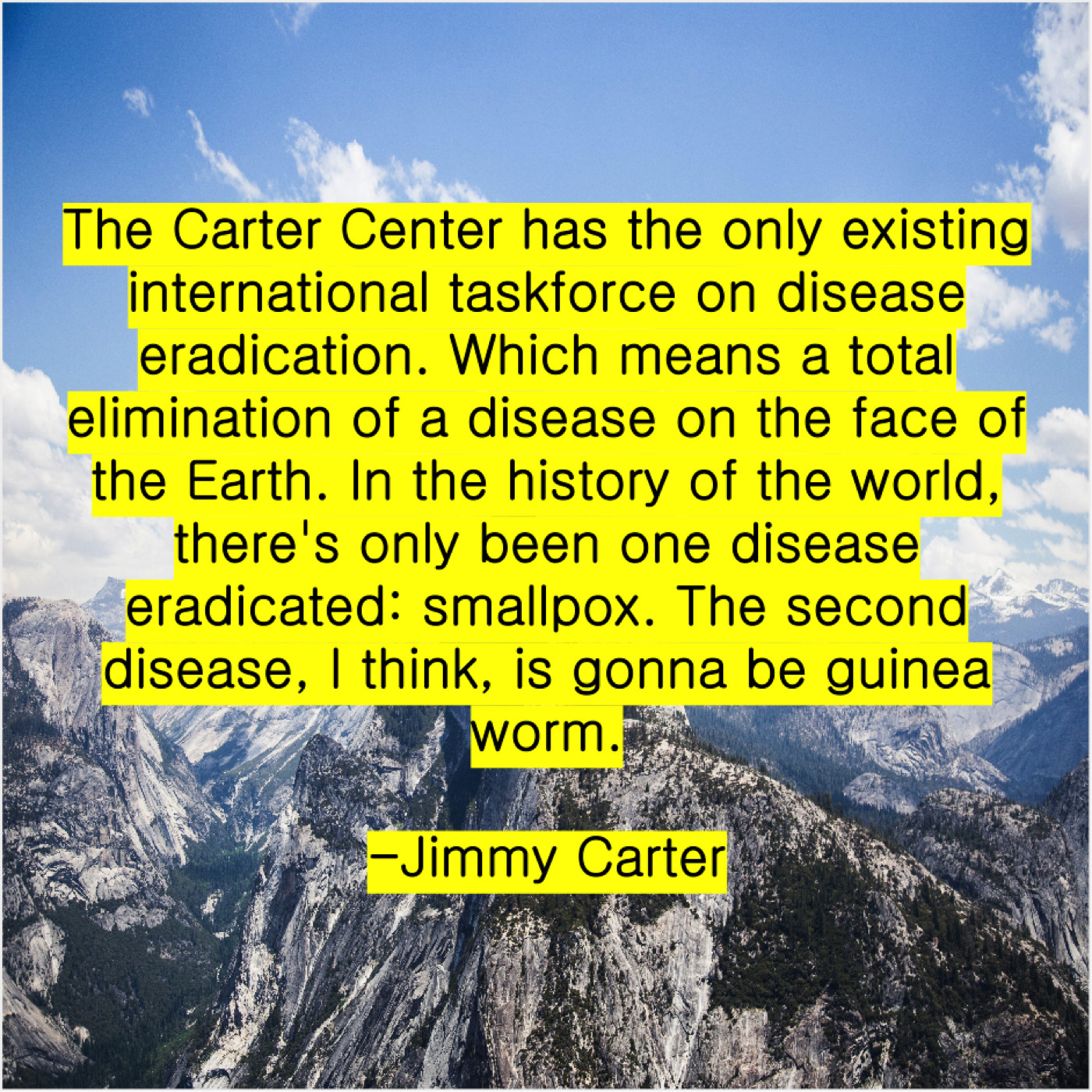 “The Carter Center has the only existing international taskforce on disease eradication. Which means a total elimination of a disease on the face of the Earth. In the history of the world, there’s only been one disease eradicated: smallpox. The second disease, I think, is gonna be guinea worm.”