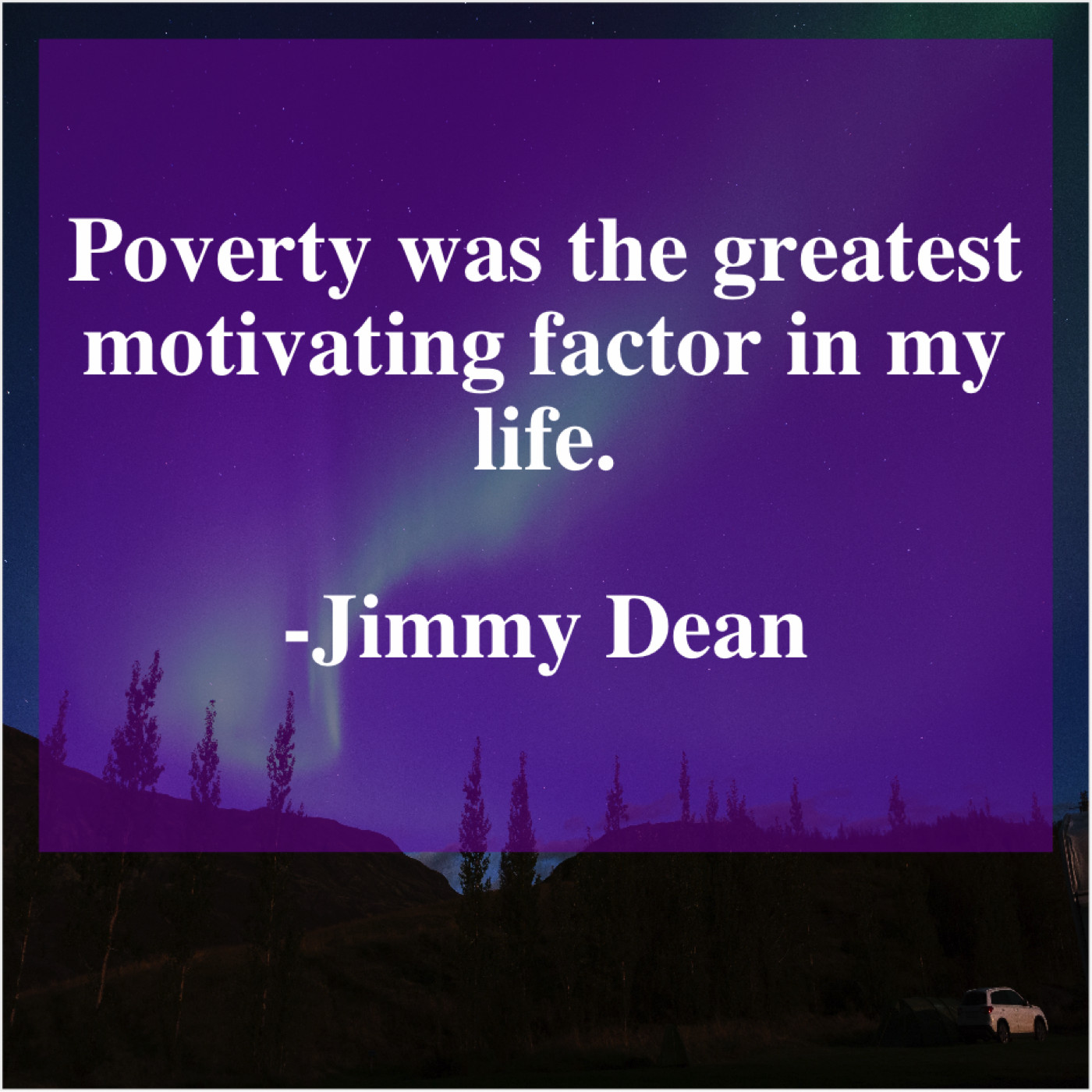 Jimmy Dean Jimmy Dean – Poverty was the greatest motivating… February 7, 2019 admin “Poverty was the greatest motivating factor in my life.”-Jimmy Dean