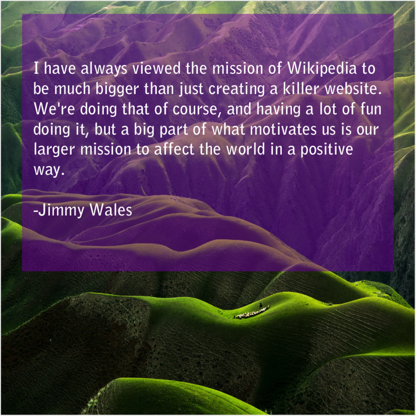 “I have always viewed the mission of Wikipedia to be much bigger than just creating a killer website. We’re doing that of course, and having a lot of fun doing it, but a big part of what motivates us is our larger mission to affect the world in a positive way.”