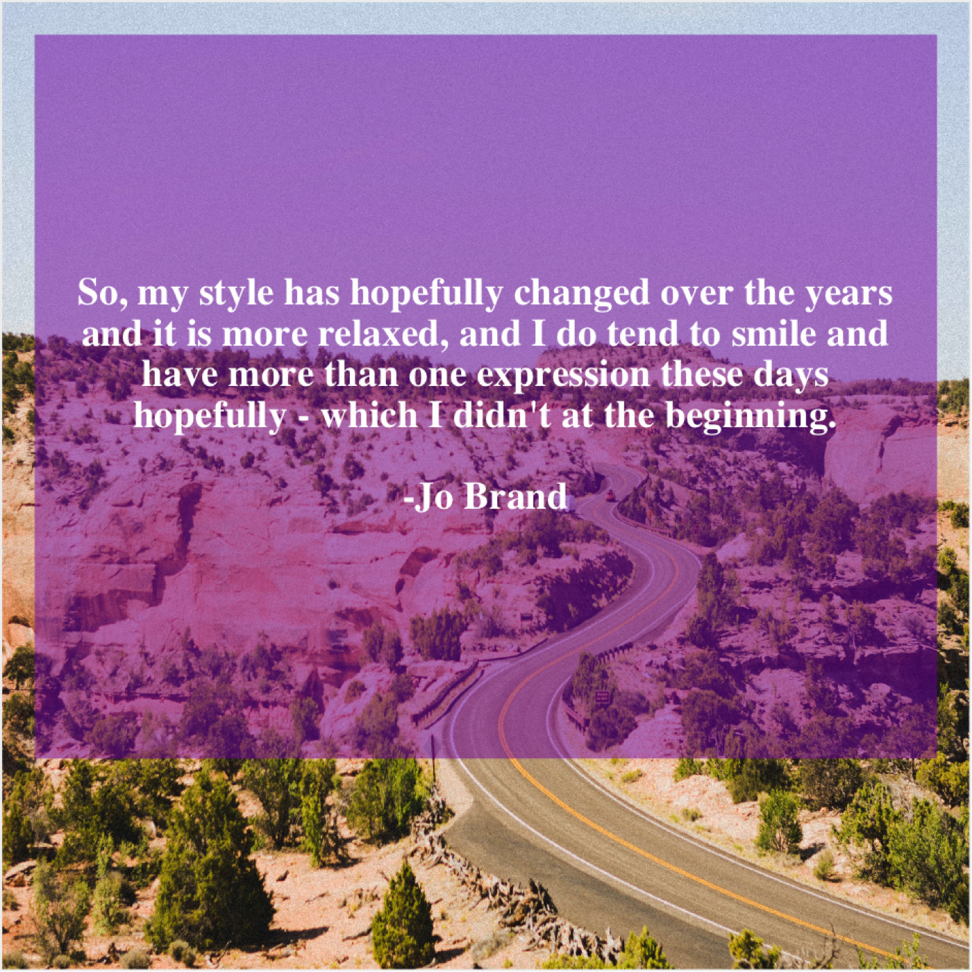 Jo Brand Jo Brand – So, my style has hopefully… May 13, 2019 admin “So, my style has hopefully changed over the years and it is more relaxed, and I do tend to smile and have more than one expression these days hopefully – which I didn’t at the beginning.”-Jo Brand