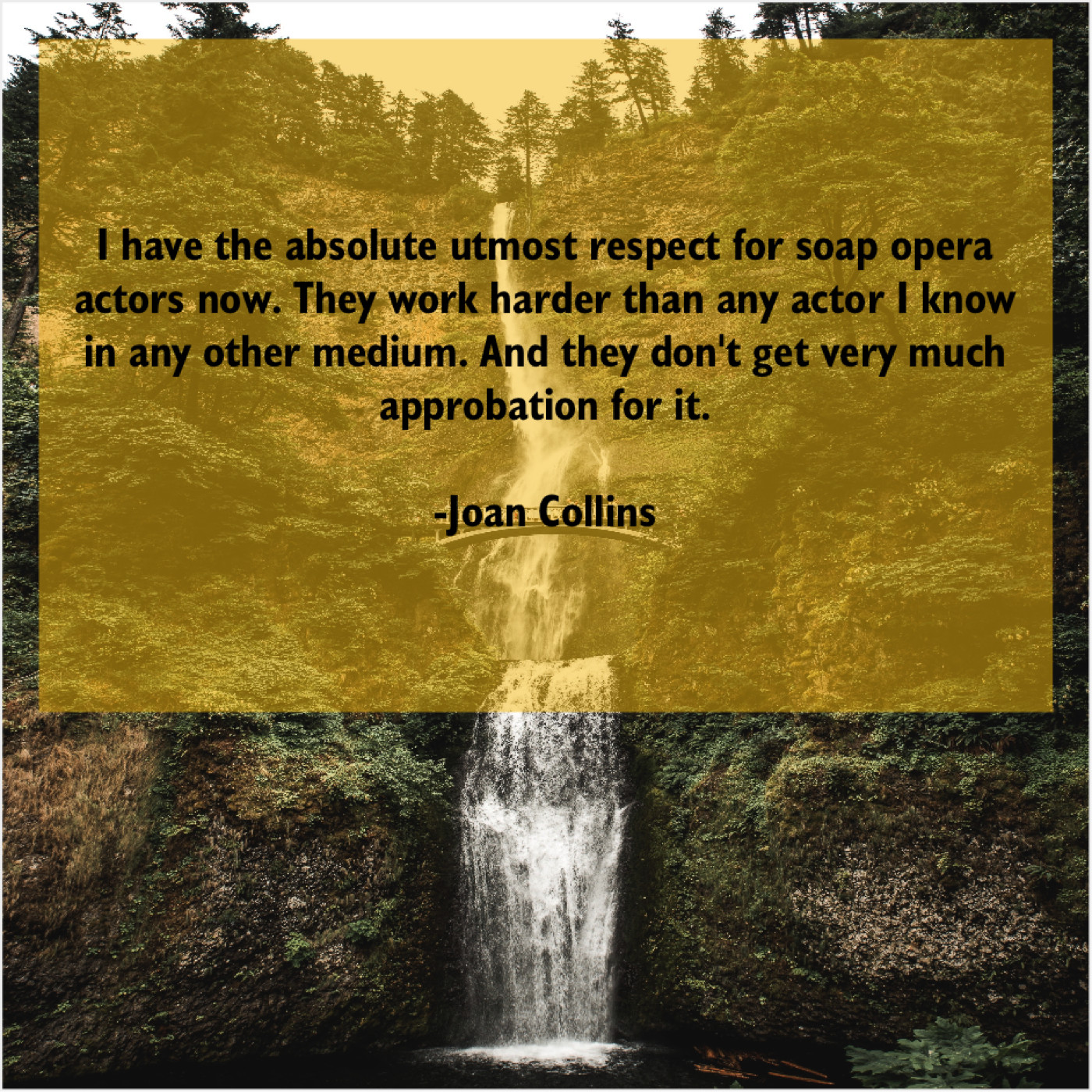 Joan Collins Joan Collins – I have the absolute utmost… January 11, 2019 admin “I have the absolute utmost respect for soap opera actors now. They work harder than any actor I know in any other medium. And they don’t get very much approbation for it.”-Joan Collins