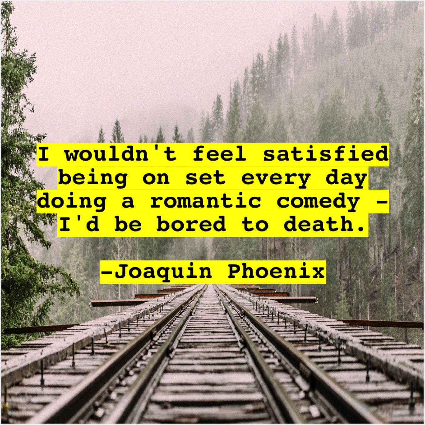 Joaquin Phoenix Joaquin Phoenix – I wouldn’t feel satisfied being… March 26, 2019 admin “I wouldn’t feel satisfied being on set every day doing a romantic comedy – I’d be bored to death.”-Joaquin Phoenix