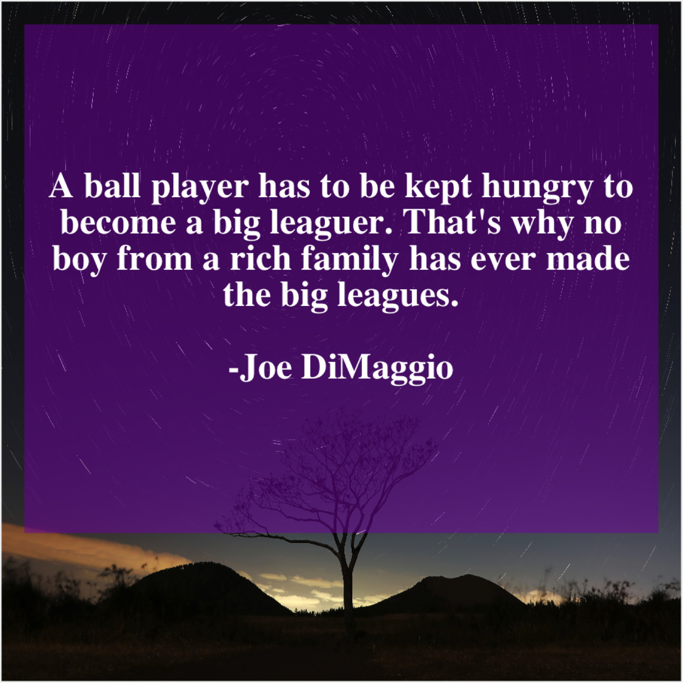Joe DiMaggio Joe DiMaggio – A ball player has to… January 7, 2019 admin “A ball player has to be kept hungry to become a big leaguer. That’s why no boy from a rich family has ever made the big leagues.”-Joe DiMaggio