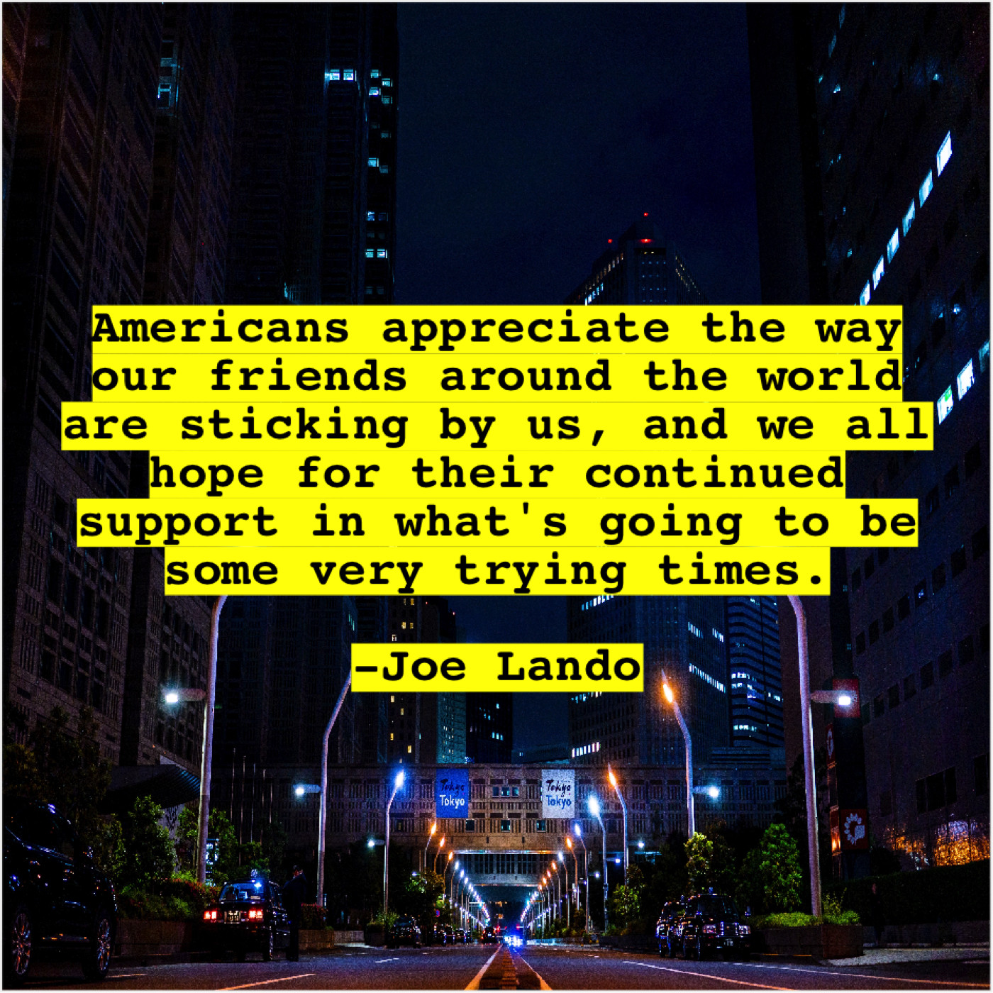 Joe Lando Joe Lando – Americans appreciate the way our… June 7, 2019 admin “Americans appreciate the way our friends around the world are sticking by us, and we all hope for their continued support in what’s going to be some very trying times.”-Joe Lando