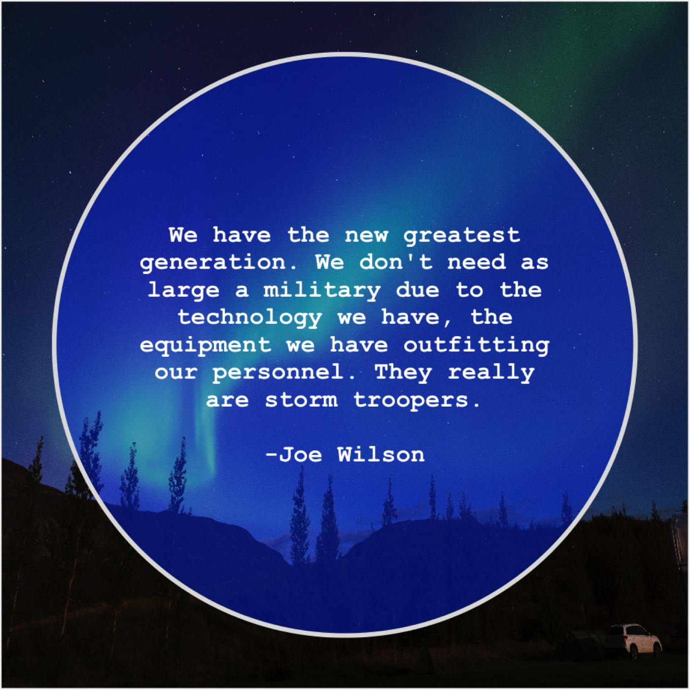 Joe Wilson Joe Wilson – We have the new greatest… January 21, 2019 admin “We have the new greatest generation. We don’t need as large a military due to the technology we have, the equipment we have outfitting our personnel. They really are storm troopers.”-Joe Wilson