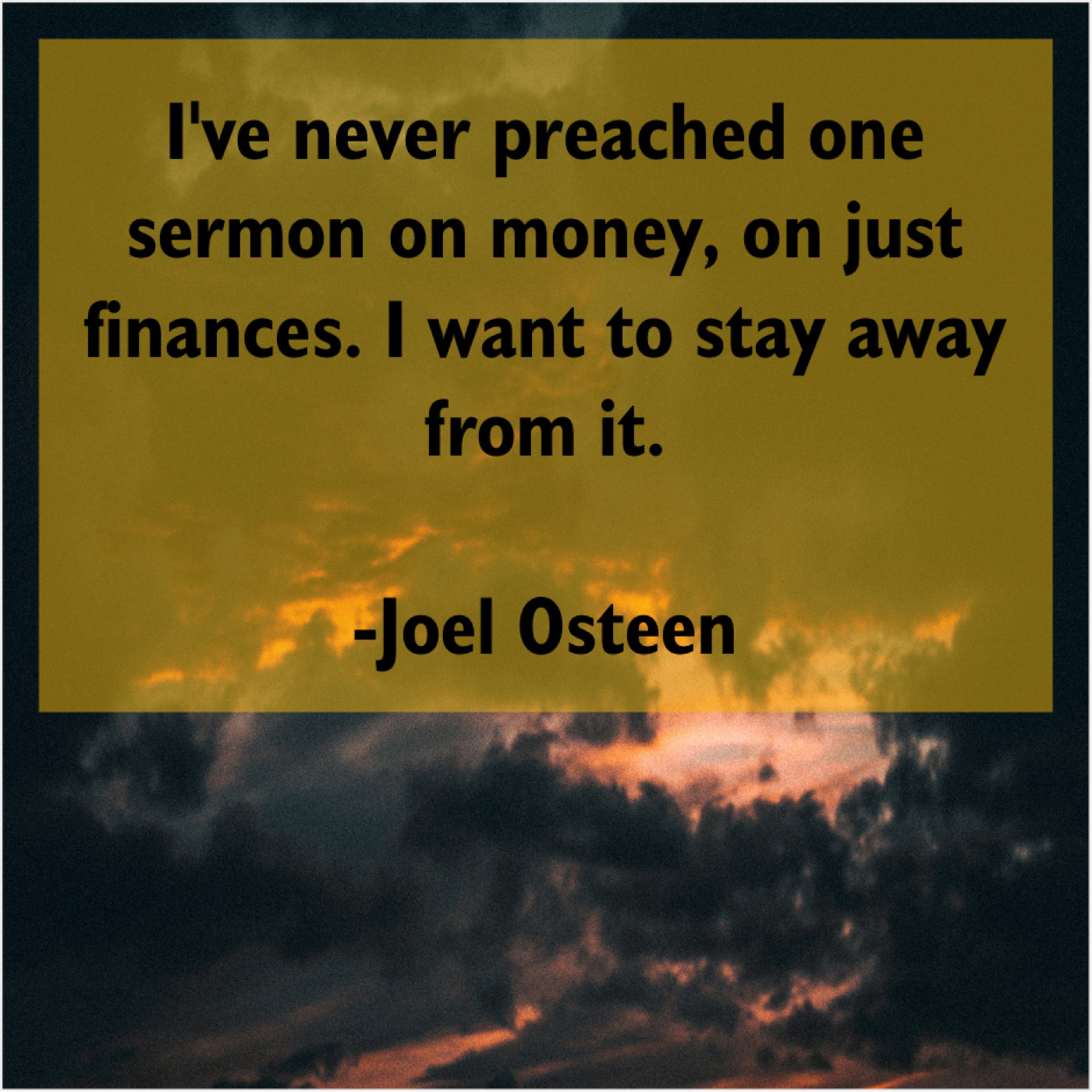 Joel Osteen Joel Osteen – I’ve never preached one sermon… July 17, 2019 admin “I’ve never preached one sermon on money, on just finances. I want to stay away from it.”-Joel Osteen