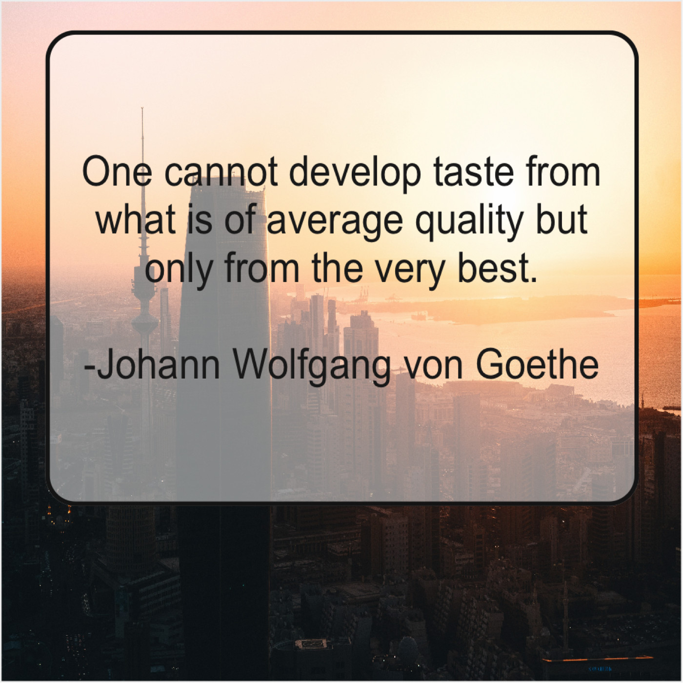 Johann Wolfgang von Goethe Johann Wolfgang von Goethe – One cannot develop taste from… August 15, 2019 admin “One cannot develop taste from what is of average quality but only from the very best.”-Johann Wolfgang von Goethe