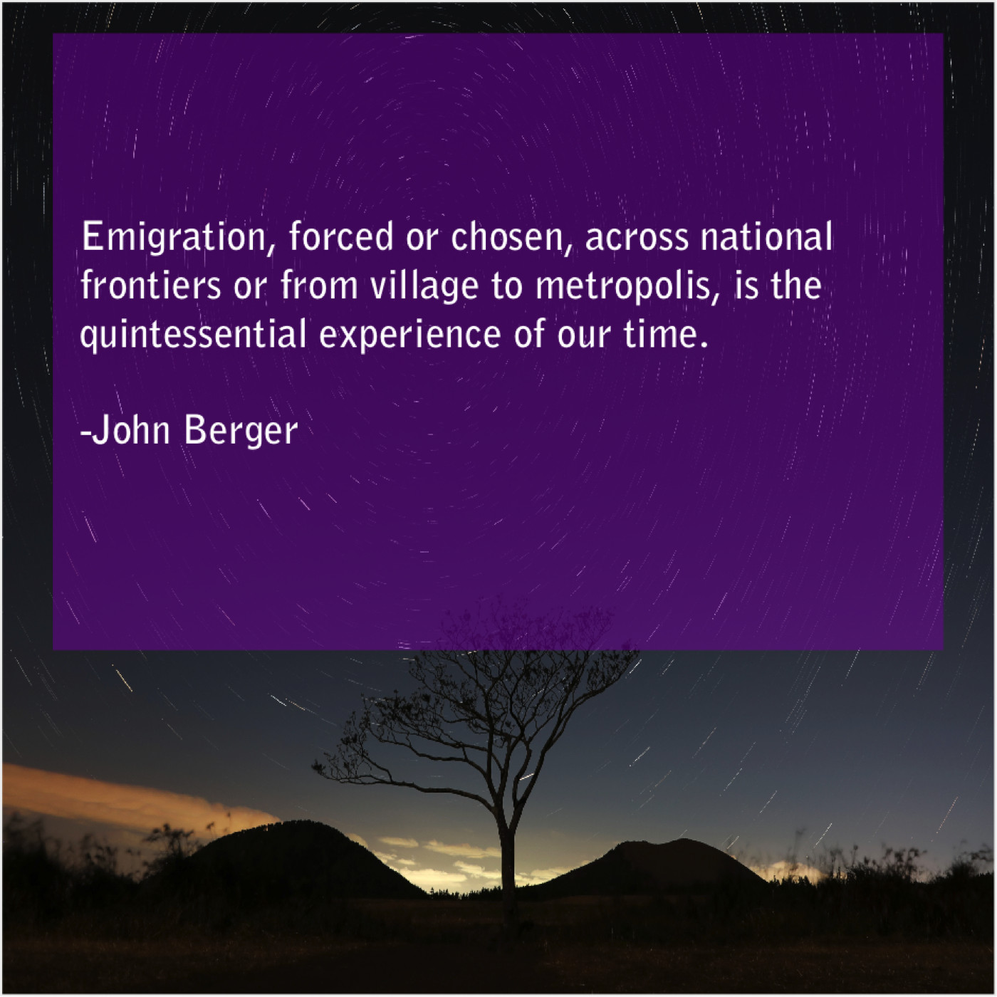 John Berger John Berger – Emigration, forced or chosen, across… September 18, 2019 admin “Emigration, forced or chosen, across national frontiers or from village to metropolis, is the quintessential experience of our time.”-John Berger