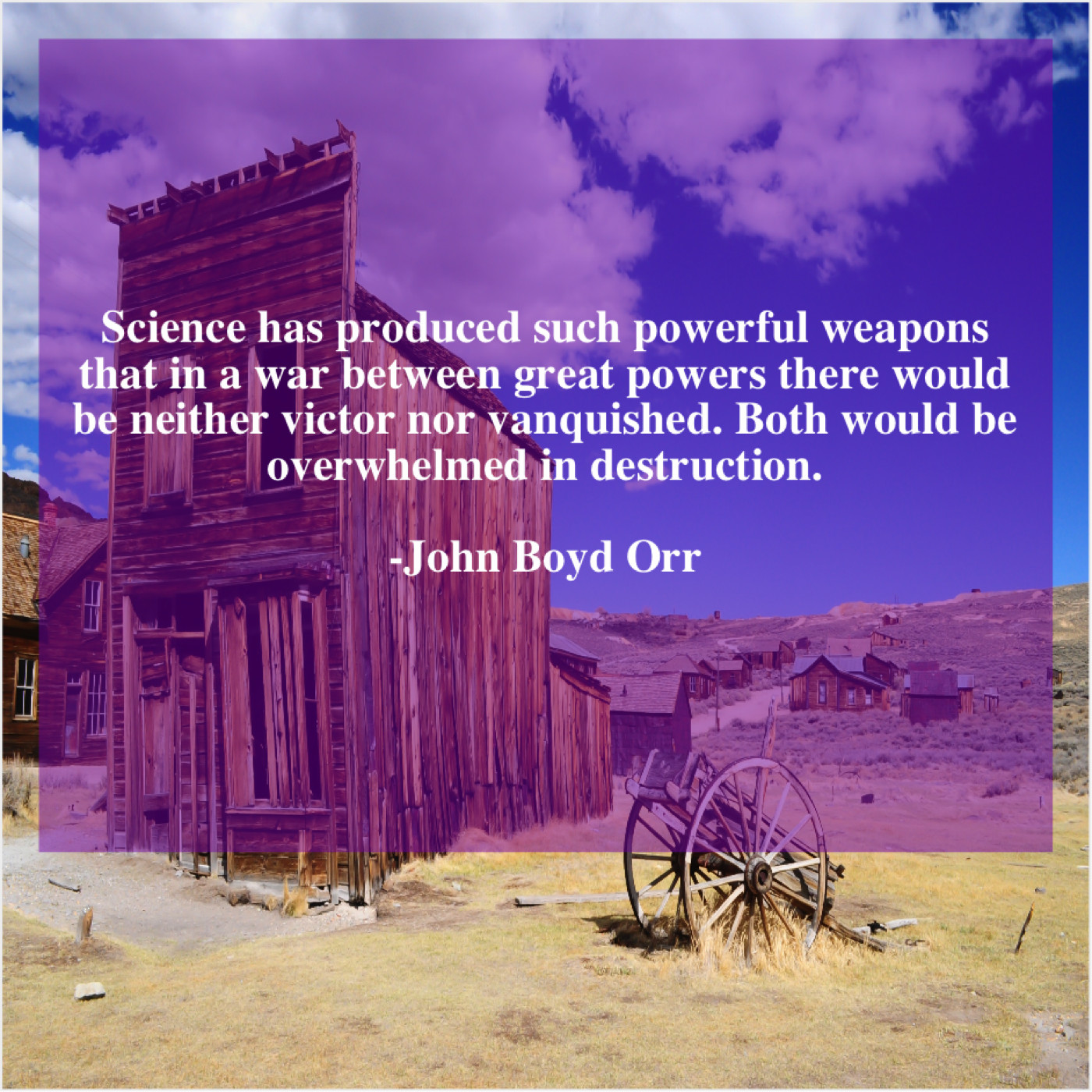 John Boyd Orr John Boyd Orr – Science has produced such powerful… May 30, 2019 admin “Science has produced such powerful weapons that in a war between great powers there would be neither victor nor vanquished. Both would be overwhelmed in destruction.”-John Boyd Orr