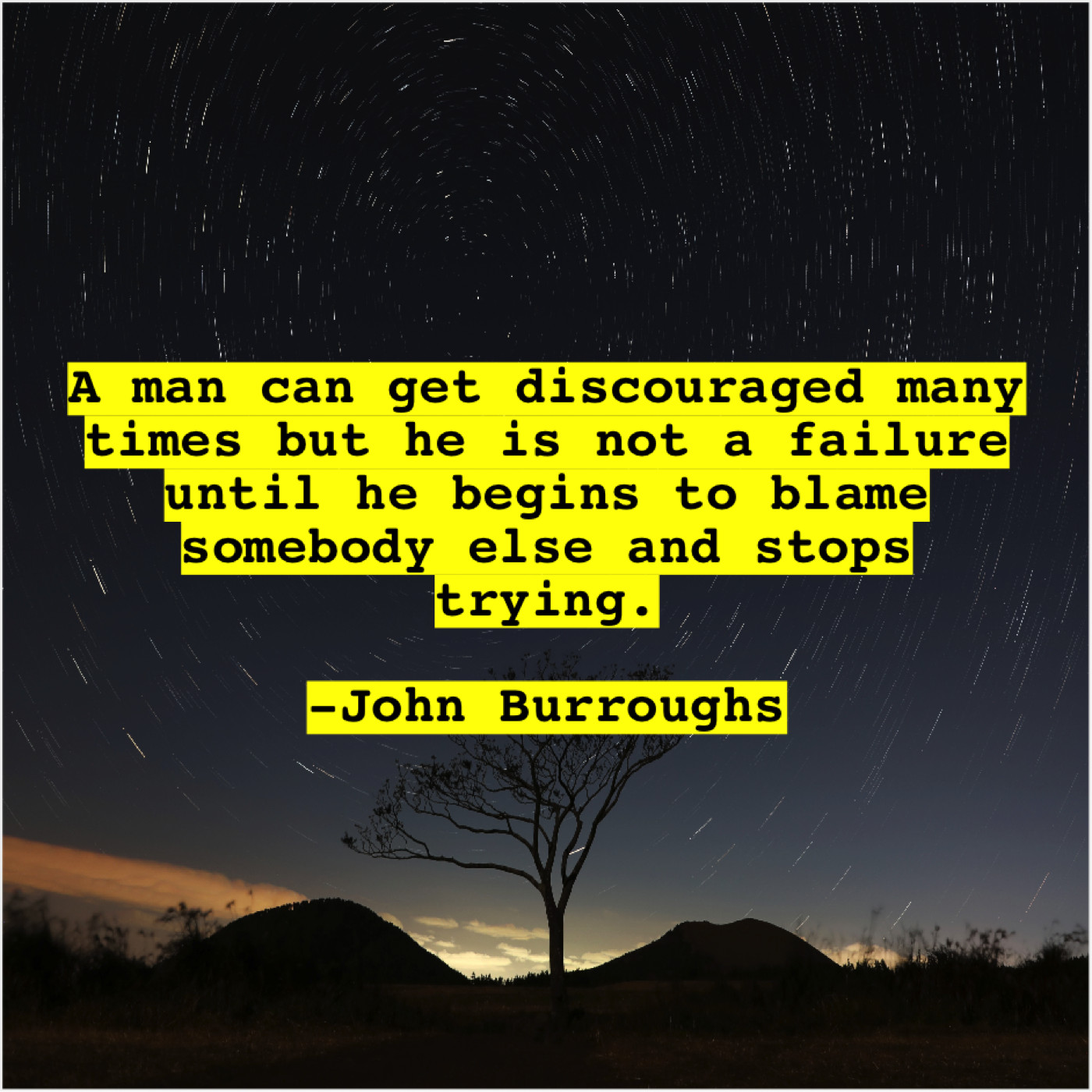 John Burroughs John Burroughs – A man can get discouraged… October 30, 2018 admin “A man can get discouraged many times but he is not a failure until he begins to blame somebody else and stops trying.”-John Burroughs