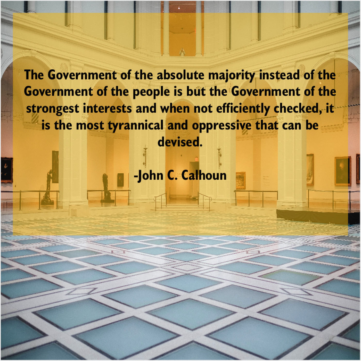 John C. Calhoun John C. Calhoun – The Government of the absolute… December 31, 2018 admin “The Government of the absolute majority instead of the Government of the people is but the Government of the strongest interests and when not efficiently checked, it is the most tyrannical and oppressive that can be devised.”-John C. Calhoun