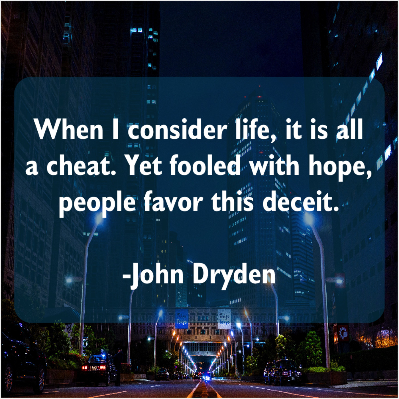 John Dryden John Dryden – When I consider life, it… May 1, 2019 admin “When I consider life, it is all a cheat. Yet fooled with hope, people favor this deceit.”-John Dryden