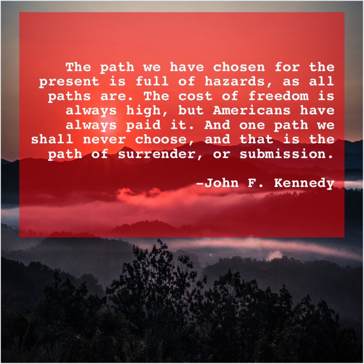 “The path we have chosen for the present is full of hazards, as all paths are. The cost of freedom is always high, but Americans have always paid it. And one path we shall never choose, and that is the path of surrender, or submission.”