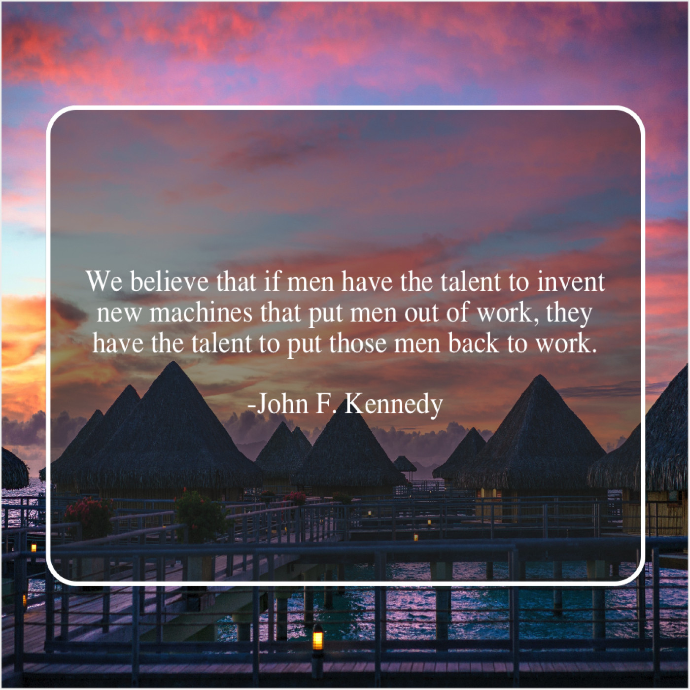 John F. Kennedy John F. Kennedy – We believe that if men… November 15, 2018 admin “We believe that if men have the talent to invent new machines that put men out of work, they have the talent to put those men back to work.”-John F. Kennedy