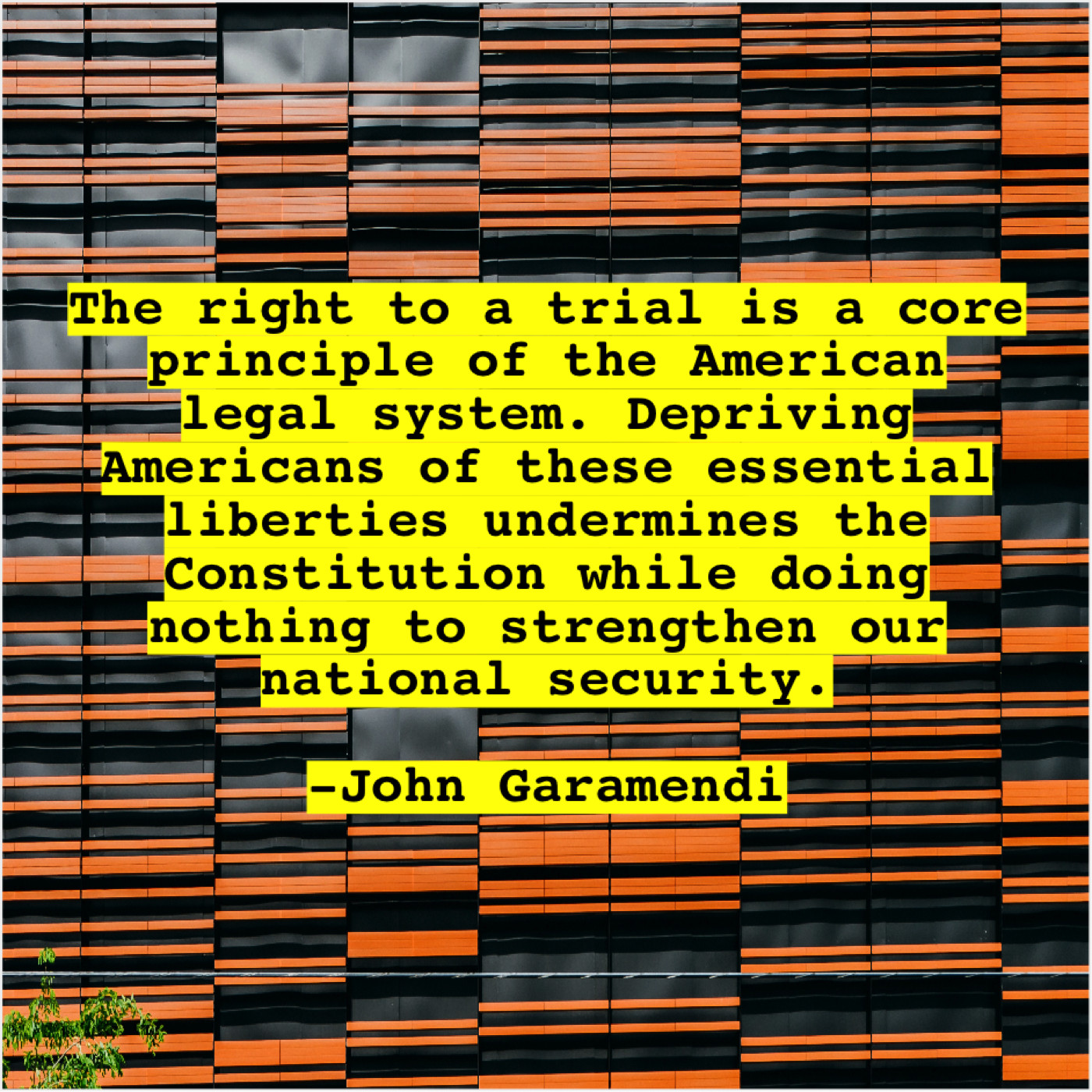 John Garamendi John Garamendi – The right to a trial… June 10, 2019 admin “The right to a trial is a core principle of the American legal system. Depriving Americans of these essential liberties undermines the Constitution while doing nothing to strengthen our national security.”-John Garamendi