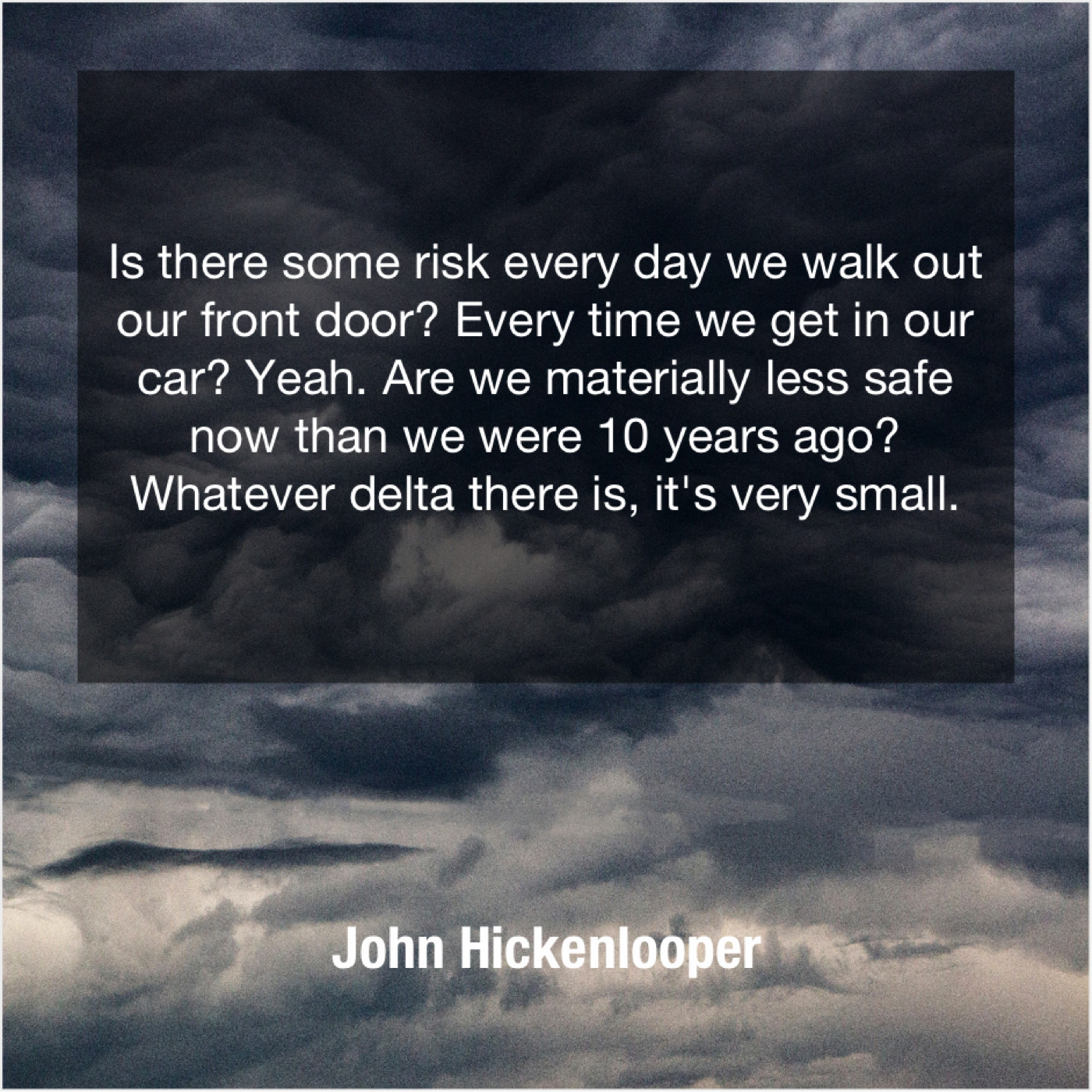 John Hickenlooper John Hickenlooper – Is there some risk every… November 21, 2018 admin “Is there some risk every day we walk out our front door? Every time we get in our car? Yeah. Are we materially less safe now than we were 10 years ago? Whatever delta there is, it’s very small.”-John Hickenlooper
