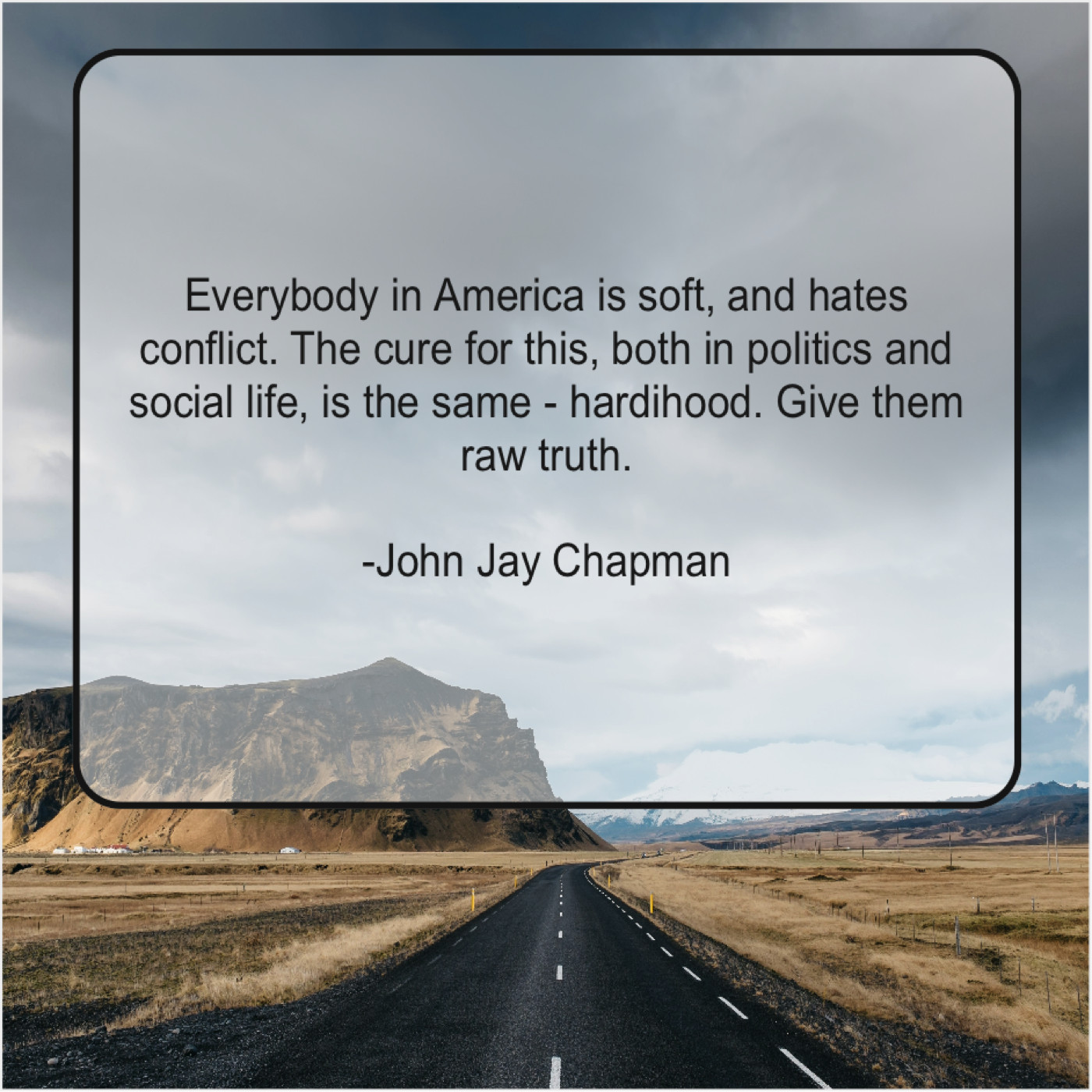 John Jay Chapman John Jay Chapman – Everybody in America is soft… March 9, 2019 admin “Everybody in America is soft, and hates conflict. The cure for this, both in politics and social life, is the same – hardihood. Give them raw truth.”-John Jay Chapman