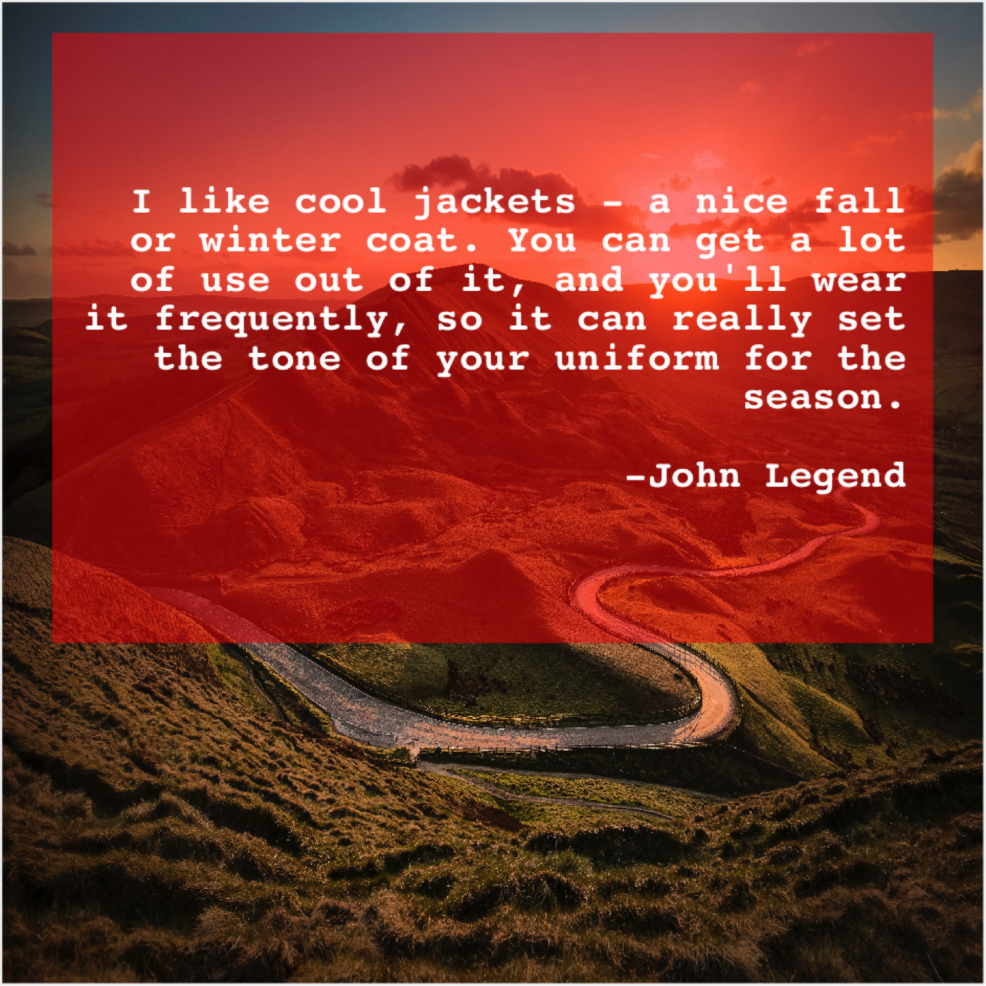 John Legend John Legend – I like cool jackets – a… June 19, 2019 admin “I like cool jackets – a nice fall or winter coat. You can get a lot of use out of it, and you’ll wear it frequently, so it can really set the tone of your uniform for the season.”-John Legend