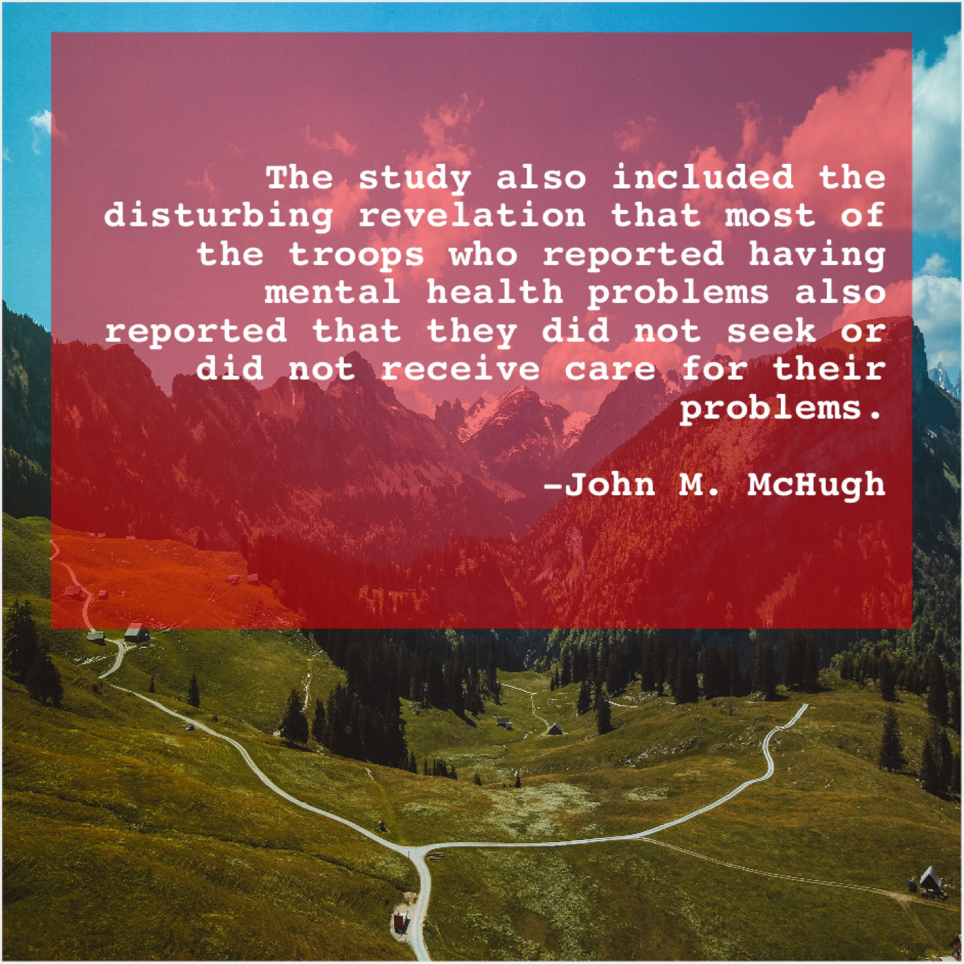 John M. McHugh John M. McHugh – The study also included the… November 29, 2018 admin “The study also included the disturbing revelation that most of the troops who reported having mental health problems also reported that they did not seek or did not receive care for their problems.”-John M. McHugh