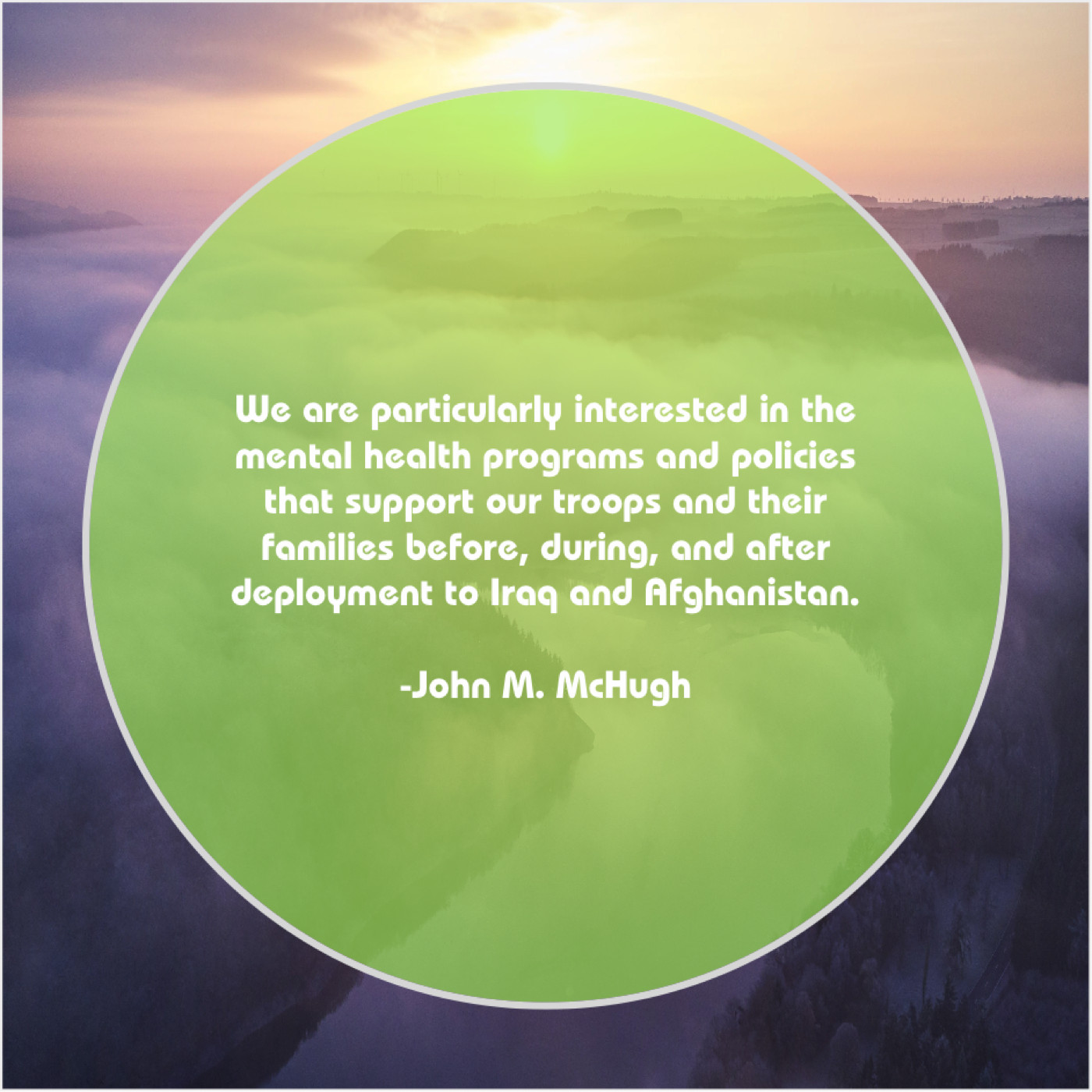 John M. McHugh John M. McHugh – We are particularly interested in… January 3, 2019 admin “We are particularly interested in the mental health programs and policies that support our troops and their families before, during, and after deployment to Iraq and Afghanistan.”-John M. McHugh