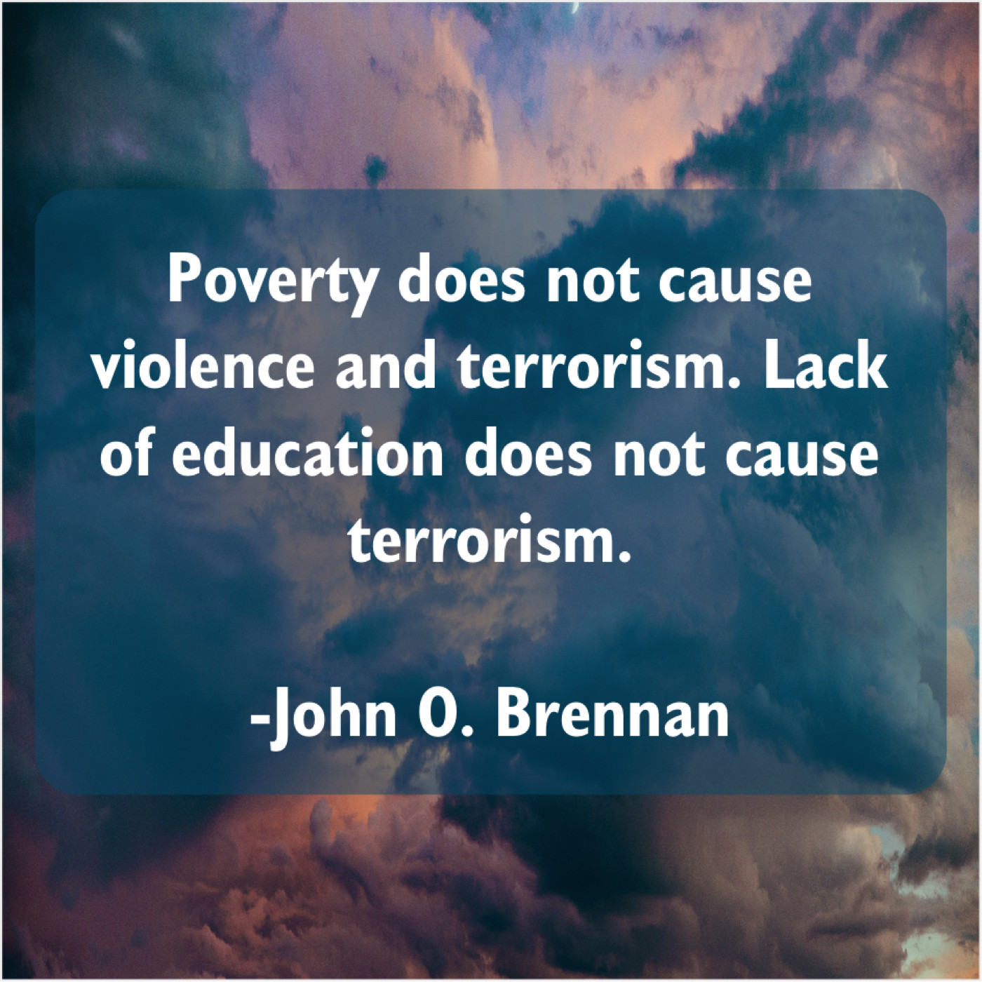 John O. Brennan John O. Brennan – Poverty does not cause violence… August 24, 2019 admin “Poverty does not cause violence and terrorism. Lack of education does not cause terrorism.”-John O. Brennan