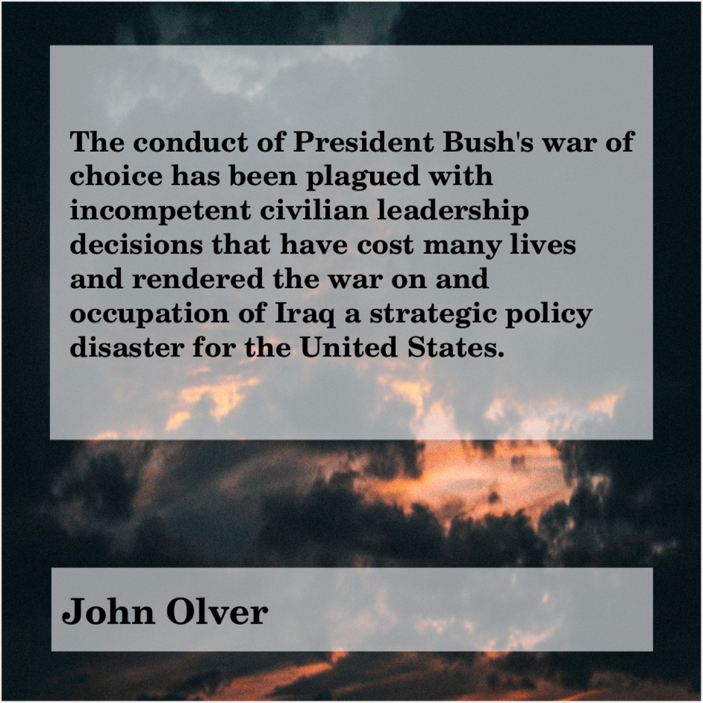 John Olver John Olver – The conduct of President Bush’s… September 21, 2019 admin “The conduct of President Bush’s war of choice has been plagued with incompetent civilian leadership decisions that have cost many lives and rendered the war on and occupation of Iraq a strategic policy disaster for the United States.”-John Olver