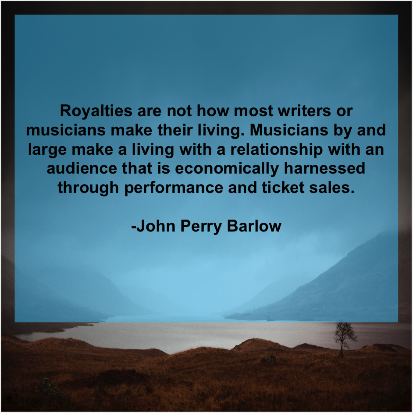 John Perry Barlow John Perry Barlow – Royalties are not how most… July 24, 2019 admin “Royalties are not how most writers or musicians make their living. Musicians by and large make a living with a relationship with an audience that is economically harnessed through performance and ticket sales.”-John Perry Barlow
