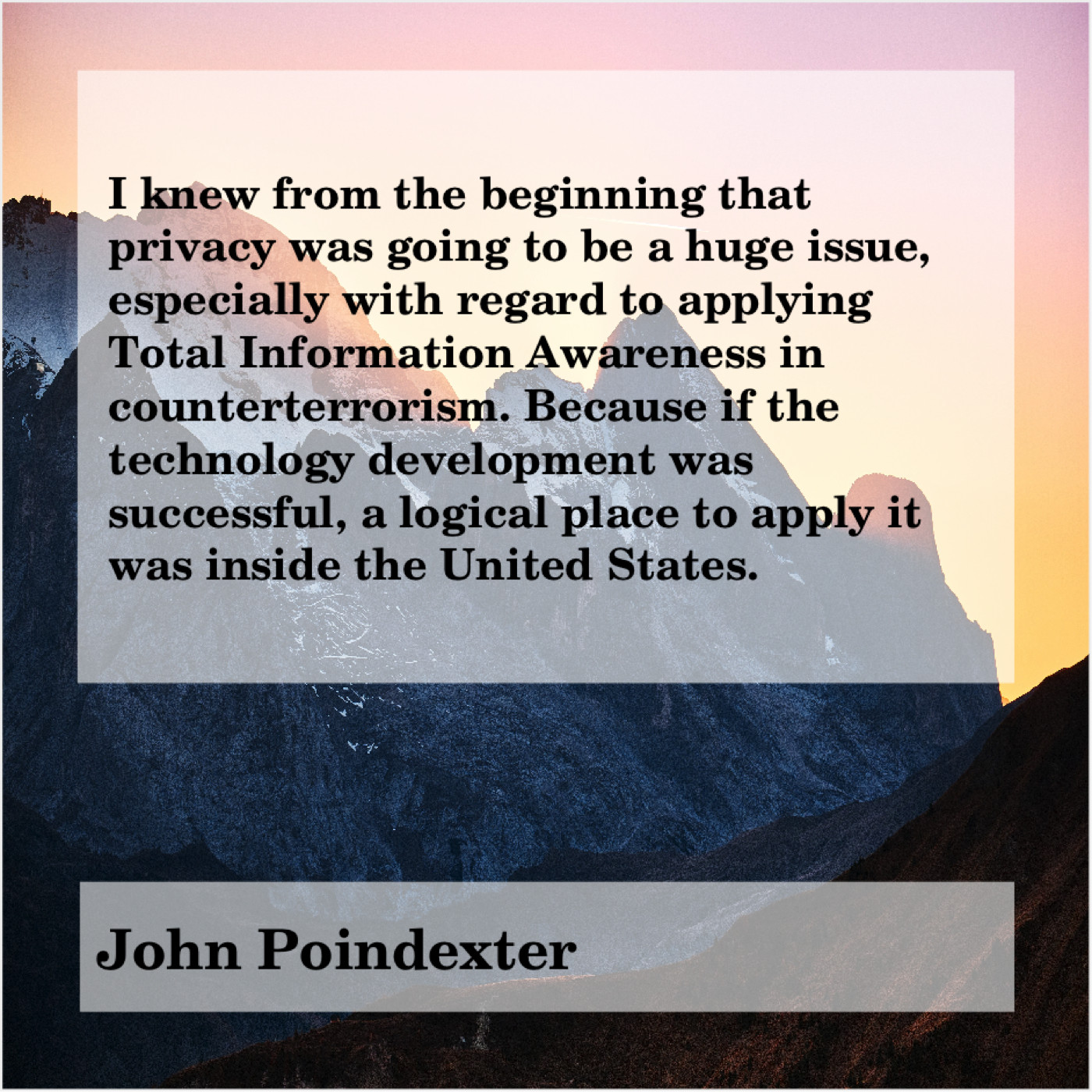 “I knew from the beginning that privacy was going to be a huge issue, especially with regard to applying Total Information Awareness in counterterrorism. Because if the technology development was successful, a logical place to apply it was inside the United States.”