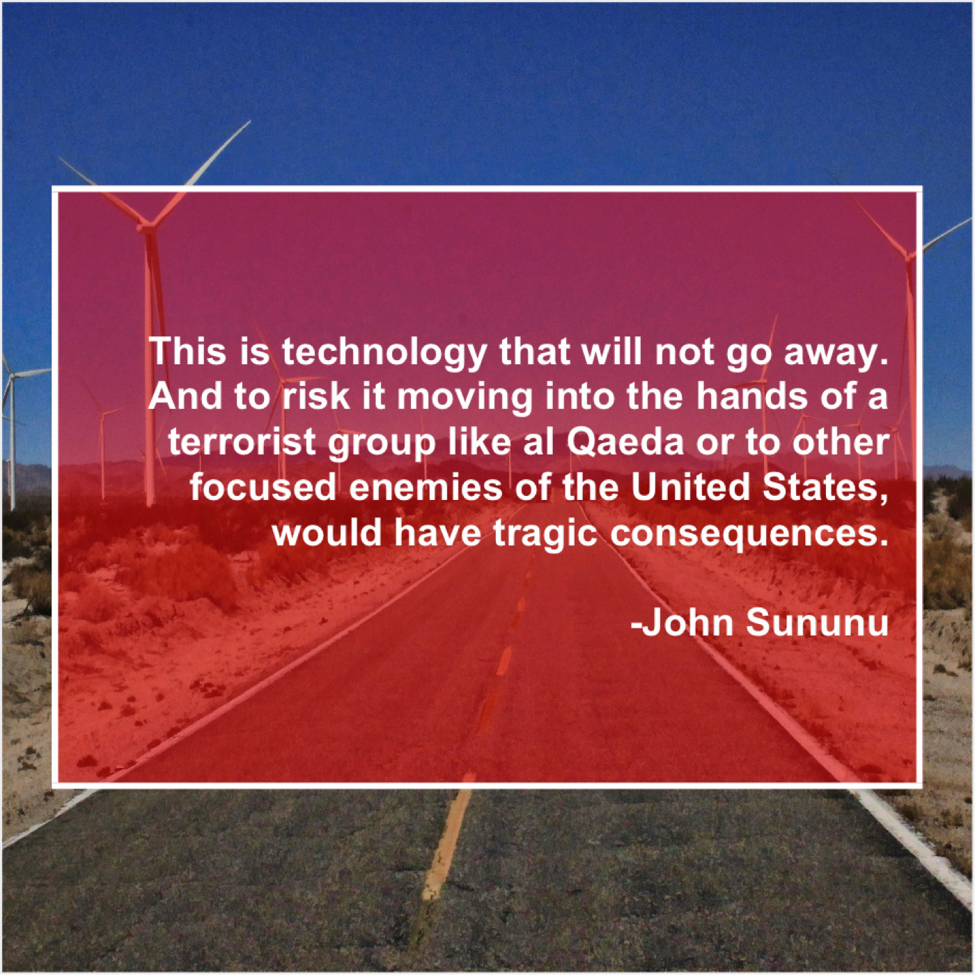 John Sununu John Sununu – This is technology that will… March 26, 2019 admin “This is technology that will not go away. And to risk it moving into the hands of a terrorist group like al Qaeda or to other focused enemies of the United States, would have tragic consequences.”-John Sununu