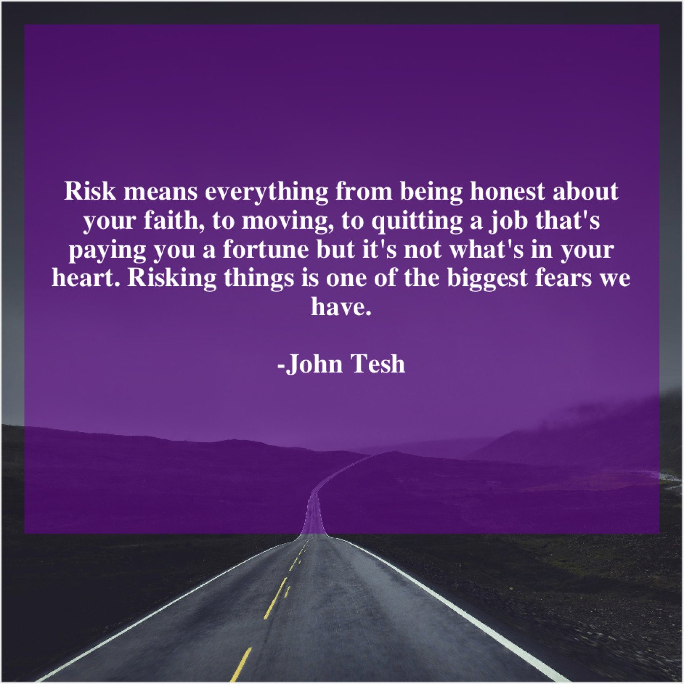 John Tesh John Tesh – Risk means everything from being… March 9, 2019 admin “Risk means everything from being honest about your faith, to moving, to quitting a job that’s paying you a fortune but it’s not what’s in your heart. Risking things is one of the biggest fears we have.”-John Tesh
