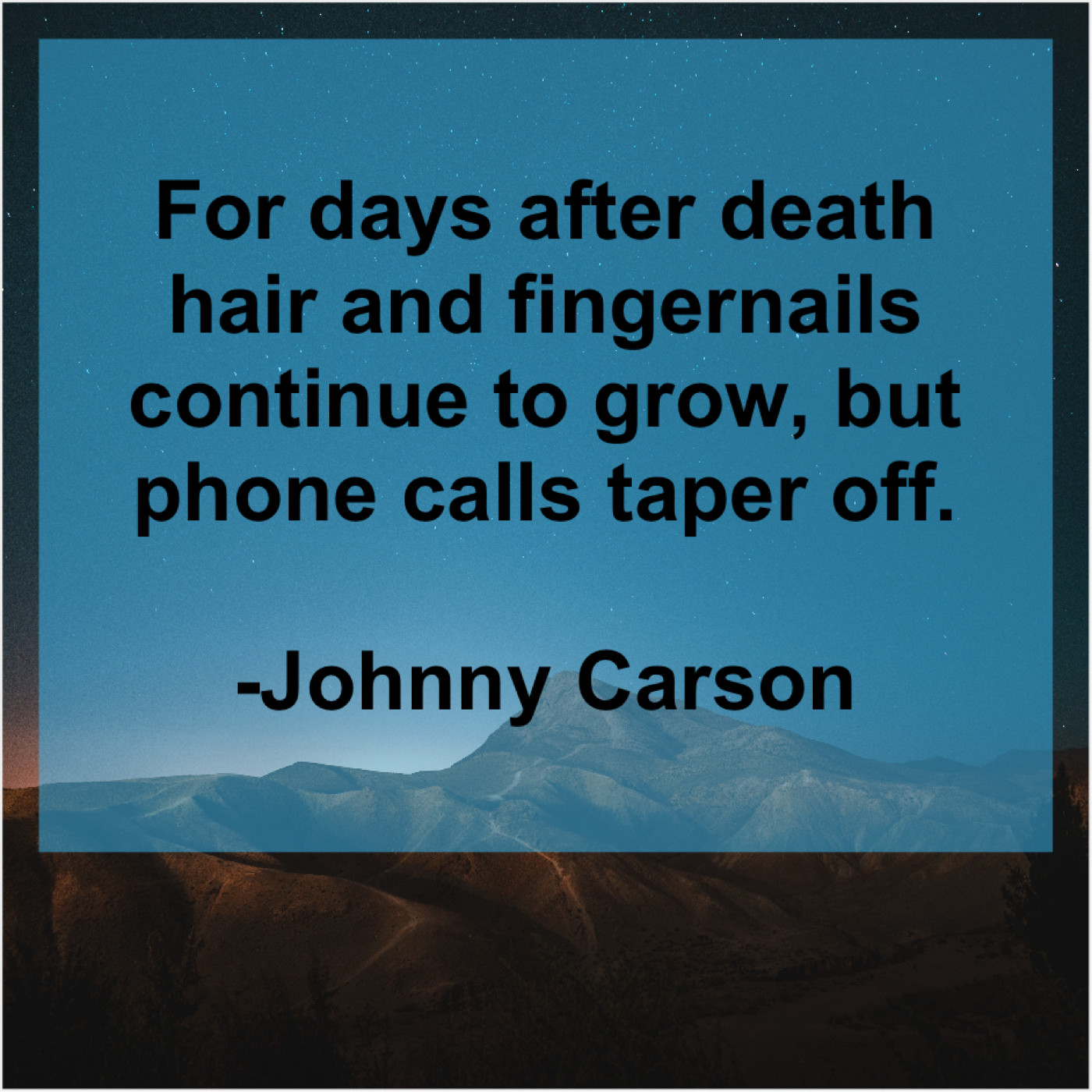 Johnny Carson Johnny Carson – For days after death hair… October 9, 2019 admin “For days after death hair and fingernails continue to grow, but phone calls taper off.”-Johnny Carson