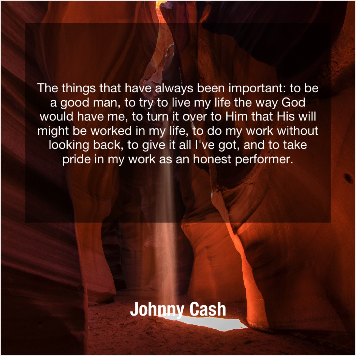 “The things that have always been important: to be a good man, to try to live my life the way God would have me, to turn it over to Him that His will might be worked in my life, to do my work without looking back, to give it all I’ve got, and to take pride in my work as an honest performer.”