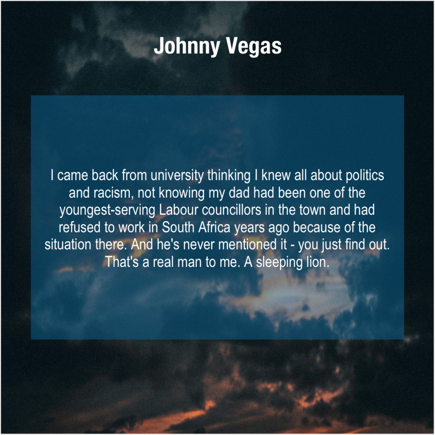 “I came back from university thinking I knew all about politics and racism, not knowing my dad had been one of the youngest-serving Labour councillors in the town and had refused to work in South Africa years ago because of the situation there. And he’s never mentioned it – you just find out. That’s a real man to me. A sleeping lion.”