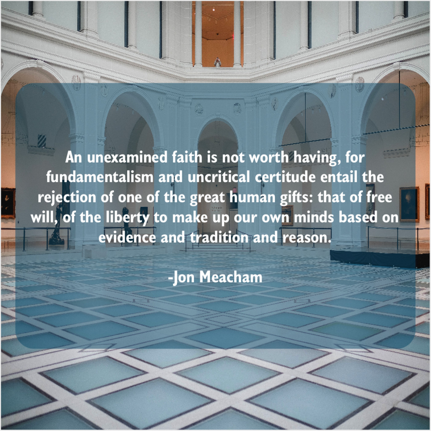 “An unexamined faith is not worth having, for fundamentalism and uncritical certitude entail the rejection of one of the great human gifts: that of free will, of the liberty to make up our own minds based on evidence and tradition and reason.”