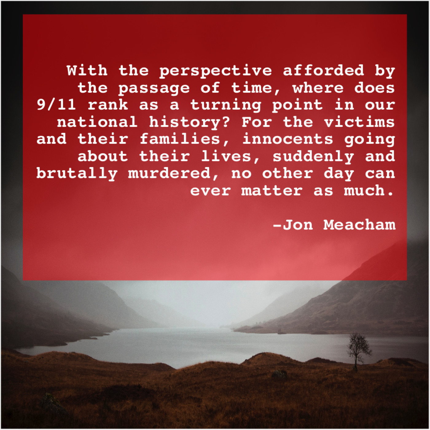 “With the perspective afforded by the passage of time, where does 9/11 rank as a turning point in our national history? For the victims and their families, innocents going about their lives, suddenly and brutally murdered, no other day can ever matter as much.”
