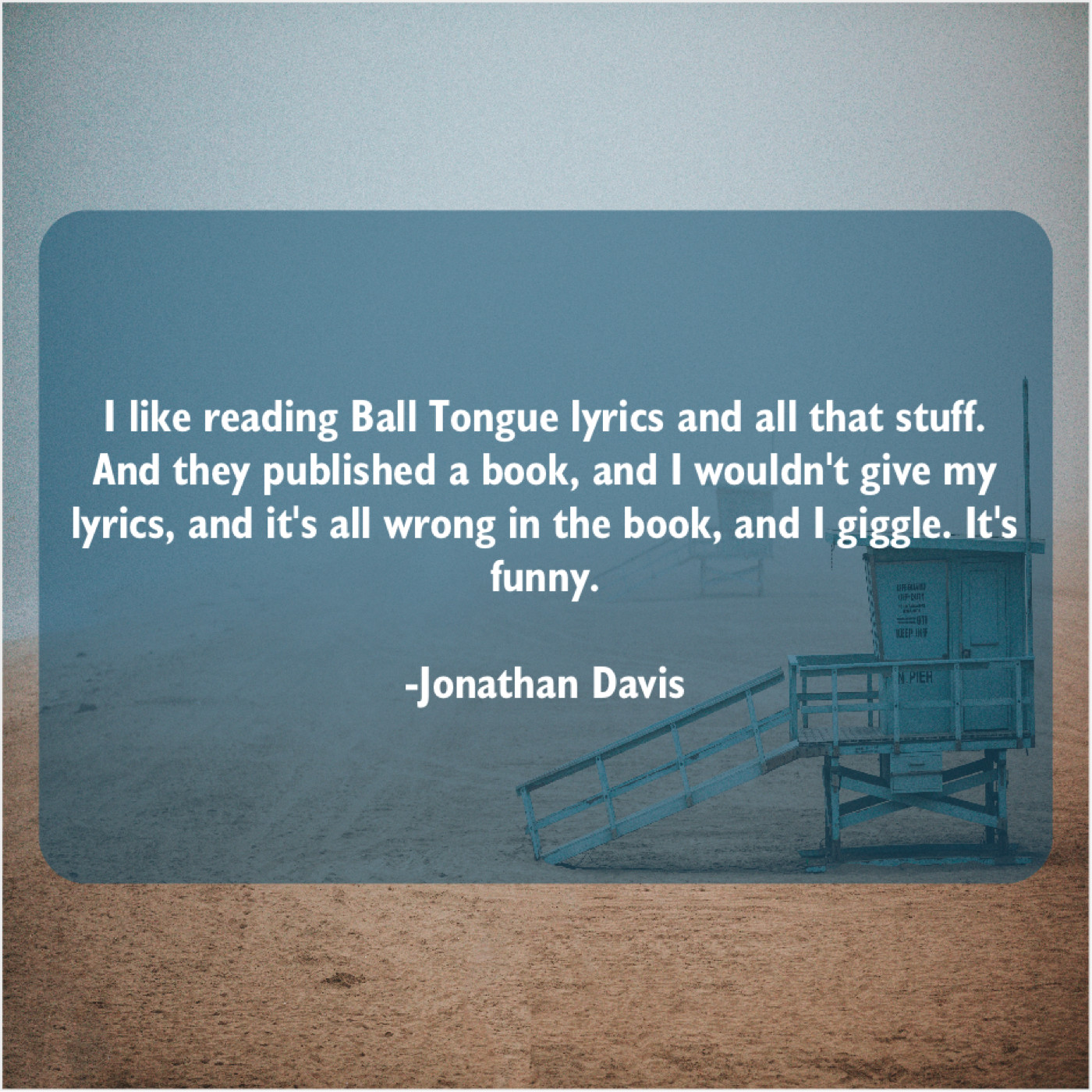Jonathan Davis Jonathan Davis – I like reading Ball Tongue… April 15, 2019 admin “I like reading Ball Tongue lyrics and all that stuff. And they published a book, and I wouldn’t give my lyrics, and it’s all wrong in the book, and I giggle. It’s funny.”-Jonathan Davis