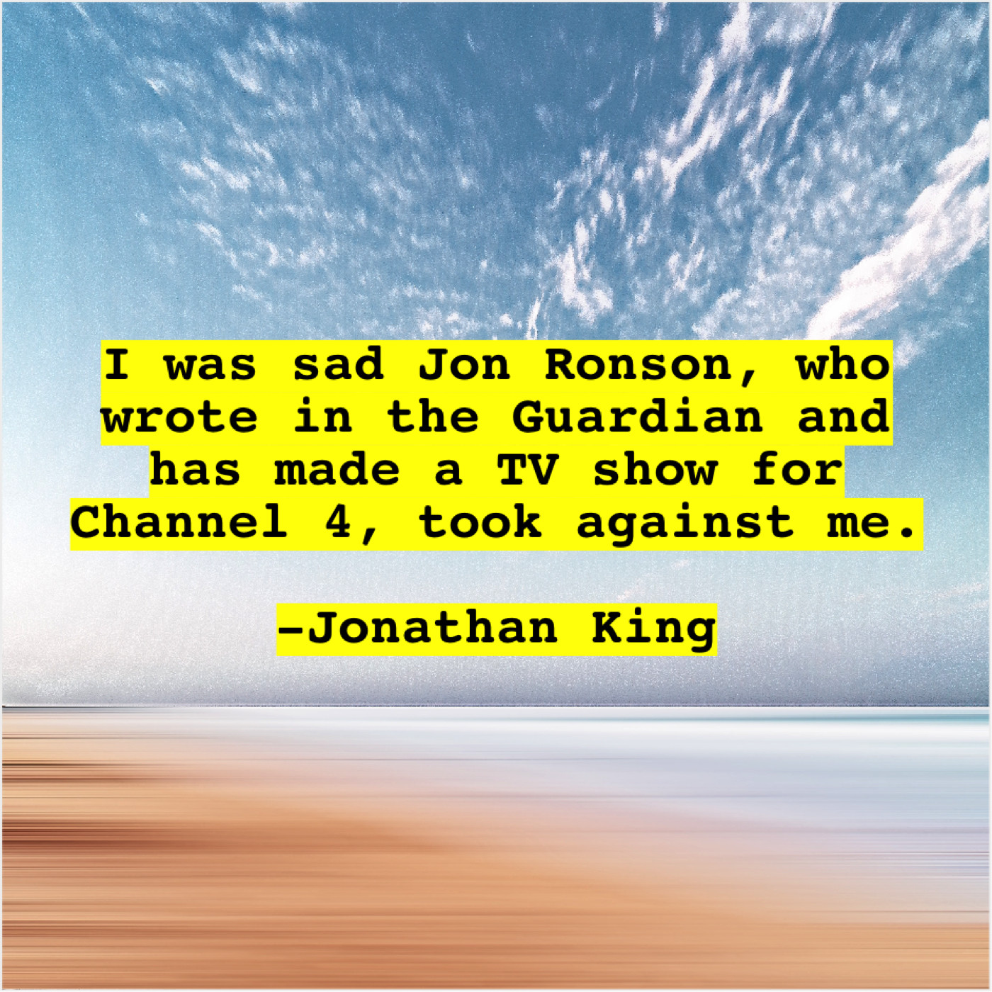 Jonathan King Jonathan King – I was sad Jon Ronson… December 23, 2018 admin “I was sad Jon Ronson, who wrote in the Guardian and has made a TV show for Channel 4, took against me.”-Jonathan King