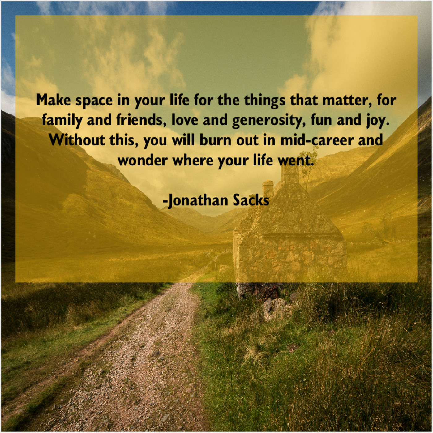 Jonathan Sacks Jonathan Sacks – Make space in your life… February 11, 2019 admin “Make space in your life for the things that matter, for family and friends, love and generosity, fun and joy. Without this, you will burn out in mid-career and wonder where your life went.”-Jonathan Sacks