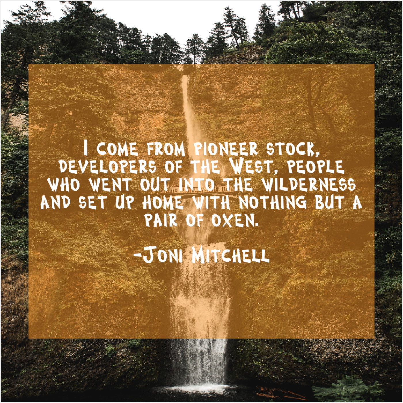 Joni Mitchell Joni Mitchell – I come from pioneer stock… March 30, 2019 admin “I come from pioneer stock, developers of the West, people who went out into the wilderness and set up home with nothing but a pair of oxen.”-Joni Mitchell