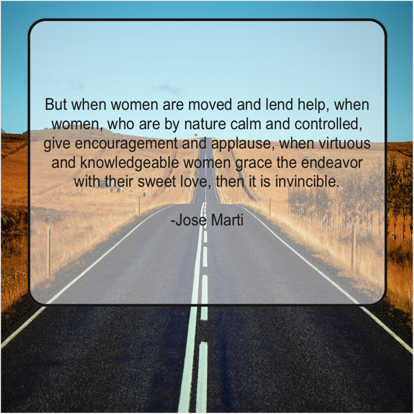 Jose Marti Jose Marti – But when women are moved… September 13, 2019 admin “But when women are moved and lend help, when women, who are by nature calm and controlled, give encouragement and applause, when virtuous and knowledgeable women grace the endeavor with their sweet love, then it is invincible.”-Jose Marti