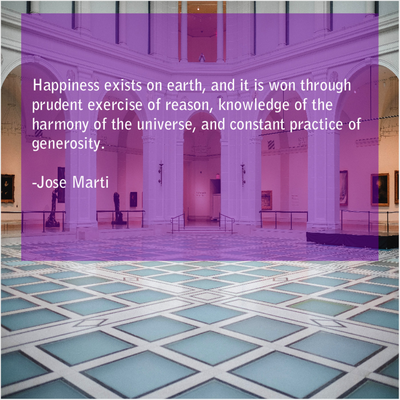 Jose Marti Jose Marti – Happiness exists on earth, and… January 11, 2019 admin “Happiness exists on earth, and it is won through prudent exercise of reason, knowledge of the harmony of the universe, and constant practice of generosity.”-Jose Marti