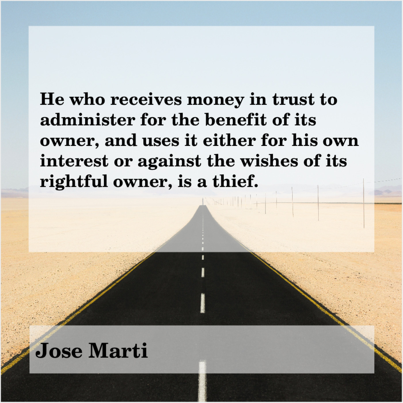 Jose Marti Jose Marti – He who receives money in… February 17, 2019 admin “He who receives money in trust to administer for the benefit of its owner, and uses it either for his own interest or against the wishes of its rightful owner, is a thief.”-Jose Marti