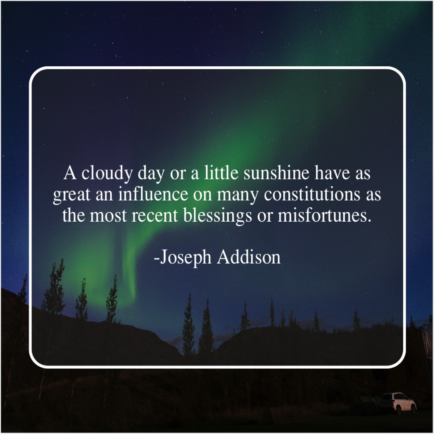 Joseph Addison Joseph Addison – A cloudy day or a… June 3, 2019 admin “A cloudy day or a little sunshine have as great an influence on many constitutions as the most recent blessings or misfortunes.”-Joseph Addison