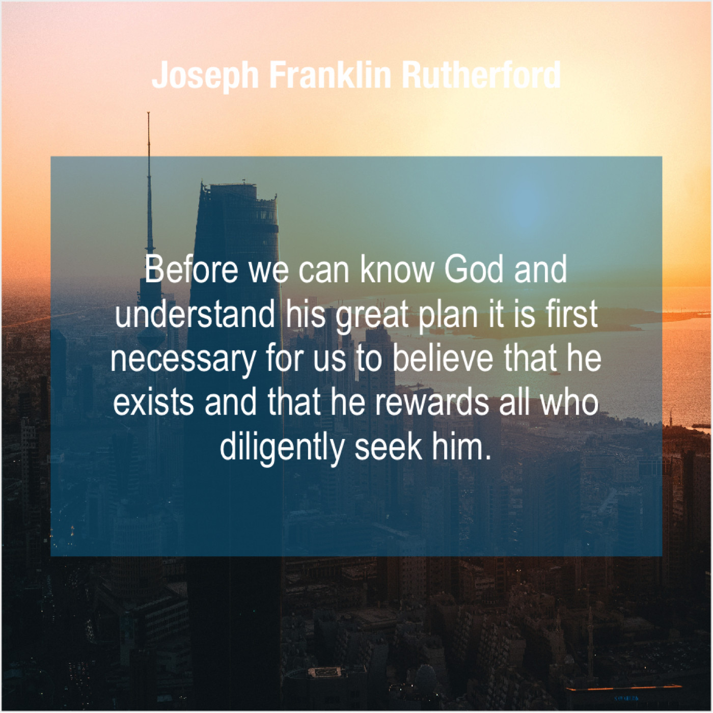 Joseph Franklin Rutherford Joseph Franklin Rutherford – Before we can know God… July 22, 2019 admin “Before we can know God and understand his great plan it is first necessary for us to believe that he exists and that he rewards all who diligently seek him.”-Joseph Franklin Rutherford